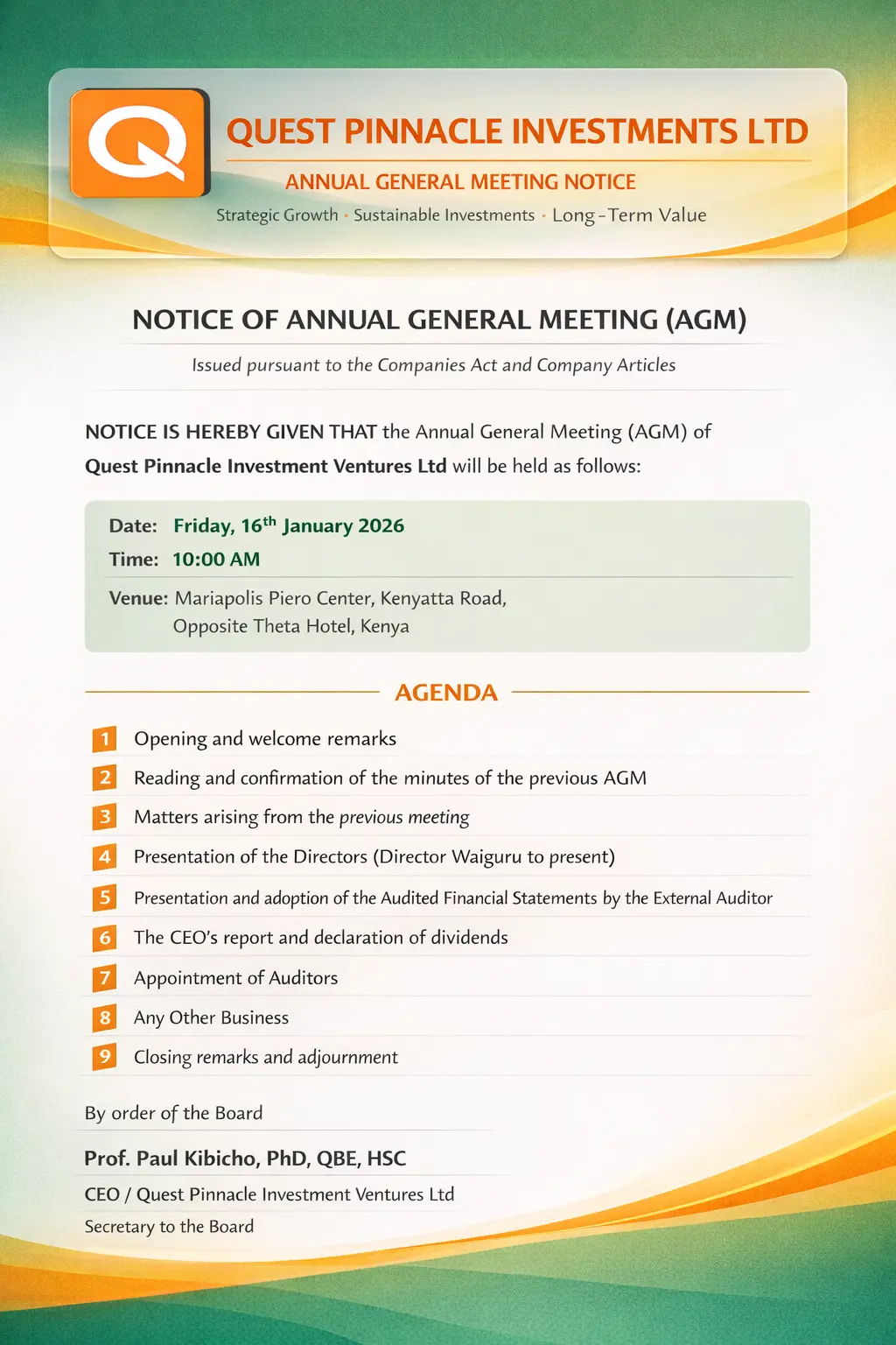 Quest Pinnacle Investment Ventures Ltd hereby notifies its shareholders, partners, and stakeholders that its Annual General Meeting (AGM) will be held as detailed below. 🏛️ Meeting Details Date: Friday, 16<sup>th</sup> January 2026Time: 10:00 AMVenue:Mariapolis Piero Center, Kenyatta RoadOpposite Theta Hotel, Kenya 📄 Notice of Annual General Meeting NOTICE IS HEREBY GIVEN THAT the Annual General […]